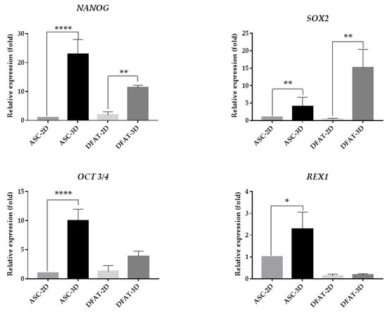 Relative expression fold values of pluripotency genes: NANOG, SOX2, OCT 3/4, and REX1 with β-ACT as a reference gene and ASCs-2D as the control group. The results are presented as mean values of 5 experiments ± SD, for * p < 0.05, ** p <0.01, **** p < 0.0001.