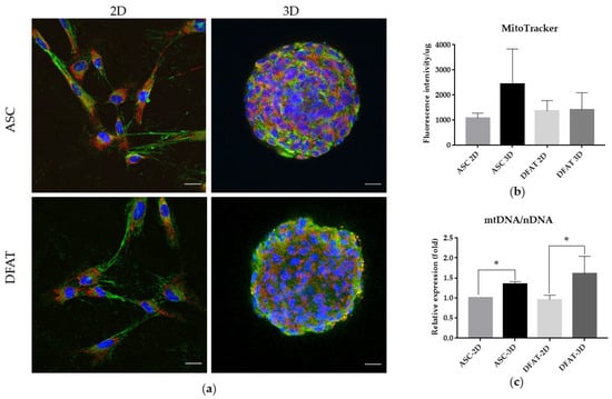 In order to determine the mitochondrial content more precisely, the mitochondrial DNA to nuclear DNA ratio (mtDNA/nDNA) was assessed. The qPCR analysis of mtDNA/nDNA showed that spheroid cultures significantly upregulated mtDNA content in both ASCs-3D and DFATs-3D. The values of mtDNA/nDNA ratio reached 1.3 ± 0.1 for ASCs-3D and 1.6 ± 0.4 for DFATs-3D and were elevated in comparison to the ASCs-2D whose mtDNA/nDNA value amounted to 1 ± 0 (Figure 7c).