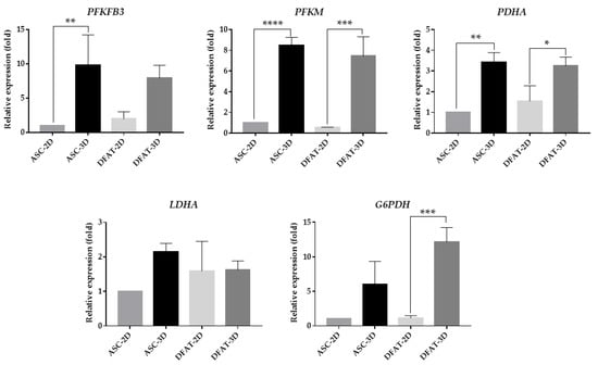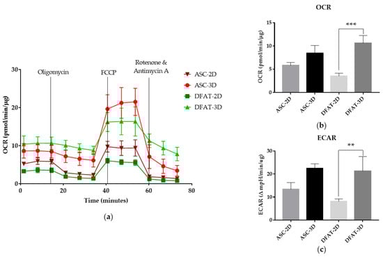 The basal OCR was recorded at 8.4 ± 1.6 pmol/min/µg for ASCs-3D, while 5.8 ± 0.6 pmol/min/µg for ASCs-2D. Moreover, O2 consumption per minute was also significantly faster in DFATs-3D than in DFATs-2D, reaching 10.6 ± 1.6 pmol/min/µg in comparison to 3.5 ± 0.6 pmol/min/µg, respectively (Figure 8b). Moreover, conditions ECAR was more progressive in the ASC-3D spheroid culture than that observed in the cells grown in a monolayer ASCs-2D, 22.4 ± 2 mpH/min/ug vs. 13.4 ± 2.9 mpH/min/ug. A similar correlation was observed in the DFATs population, where the extracellular acidification rate was higher in DFATs-3D (21.3 ± 6.3 mpH/min/ug) than in DFATs-2D (8.14 ± 1 mpH/min/ug) (Figure 8c).
