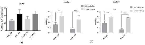 Moreover, we showed that the 3D culture might significantly lower intracellular lactate production as compared to cells cultured as a monolayer. We found that ASCs-3Dproduced 0.12 nmol/µg ± 0.05 of Lactate, while DFATs-3D generated approximately 0.13 nmol/µg ± 0.02. In monolayers, the values were higher and up to 0.36 nmol/µg ± 0.09 in ASCs-2Dand 0.31 nmol/µg ± 0.08 in DFATs-2D. The differences in extracellular lactate concentration were not statistically significant and they ranged from approximately 0.6–0.5 nmol/ µg ± 0.1–0.15 nmol/ µg (Figure 9b).