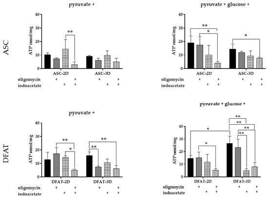 In addition, effects of oligomycin and iodoacetate on ATP content in 2D and 3D ASCs cultures were comparable. In the absence of glucose, a slight, statistically insignificant increase in ATP content was observed in both 2D and 3D cultures treated with iodoacetate. In glucose-free medium an incubation with oligomycin resulted in a minor drop in ADP phosphorylation in both types of ASCs culture. A slight reduction in ATP content was also observed for oligomycin-treated ASC in the presence of glucose. However, in the presence of glucose an iodoacetate reduced ATP content substantially in 2D and 3D, however, no statistical significance was recorded. Thus, the type of culture seems to have little effect on ASCs capacity for ATP biosynthesis. The ASCs seem to rely on both pathways of ATP formation-anaerobic glycolysis and oxidative phosphorylation- and the contribution of each of them may be dependent on the glucose availability.