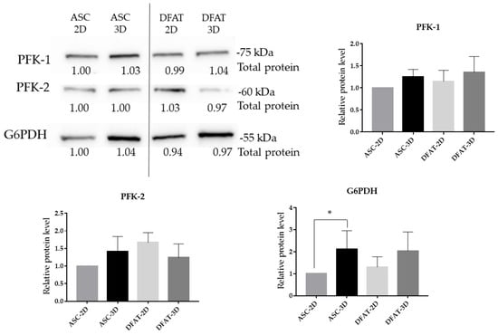 Western blot analysis was performed for selected respiratory chain proteins (Total OxPhos Rodent WB Antibody Cocktail; 1:1000, ab458099, ThermoFisher Scientific), as previously described [47] and for the following proteins: phosphofructokinase-1 (PFK-1) (1:250, 55028-1-AP, Proteintech), phosphofructokinase-2 (PFK-2) (1:250, #13123, Cell Signaling) and glucose-6-phosphate dehydrogenase (G6PDH) (1:250, #12263, Cell Signaling). Spheroids and monolayer ASCs and DFATs were lysed in RIPA Lysis and Extraction Buffer (ThermoFisher Scientific) with the addition of Halt™ Protease and Phosphatase Inhibitor Cocktail (ThermoFisher Scientific). The cell extracts were separated by SDS-polyacrylamide gel electrophoresis with the use of any-kDa gels (Bio-Rad) with the amount of 40 µg of protein per line. Then, the cell extracts were electro-transferred onto a nitrocellulose membrane (Amersham, Sigma-Aldrich). In Western blot the following OxPhos complexes subunits were detected: NDUFB8 (complex I), CII-30 kDa (complex II); CIII-Core 2 subunit (complex III); C-IV-II subunit (complex IV); ATP synthase subunit alpha (complex V). All stripes were visualized by ECL™ Western Blotting Detection Reagents (Amersham™). The chemiluminescent signal was detected and quantified using the Fusion FX imaging system (Vilber Lourmat, Marne-la-Vallée, France). The band intensities of the proteins of interest were normalized to the total protein optic densities corresponding to the same lane visualized with Ponceau S and quantified using ImageJ software with a gel analyzer feature.