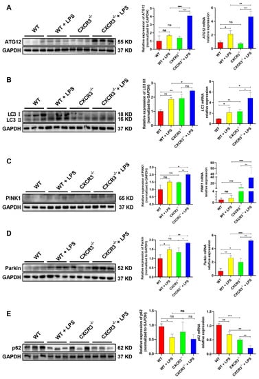 As a highly conserved degradation and regeneration program in cells, autophagy acts as an intracellular garbage disposal station, which can eliminate pathogens, promote development, inhibit tumors, maintain cell homeostasis, and participate in immune responses [12,36]. To investigate the relationship between CXCR3 and autophagy in the mice intestine, the mRNA and protein expression levels of autophagy-related genes were analyzed. As shown in Figure 2, LPS stimulation and CXCR3 knockout can induce the mRNA and protein upregulation of autophagy-related genes, as confirmed by the increased expression of ATG12 (Figure 2A) and the LC3II/LC3I ratio (Figure 2B), as well as the upregulation of the mitophagy markers PINK1 (Figure 2C) and Parkin (Figure 2D). However, for SQSTM1/p62, a prototype autophagy receptor and an autophagic substrate, the expression was blocked in the LPS group and CXCR3−/− group (Figure 2E). Importantly, CXCR3 knockout can further increase the mRNA and protein expressions of ATG12, LC3 II, PINK1, and Parkin (Figure 2A–D) and significantly decrease the expression of p62 mRNA and the protein when CXCR3−/− mice are stimulated with LPS (Figure 2E). The results showed that CXCR3 knockout can promote LPS-induced intestinal autophagy in mice intestine tissue.