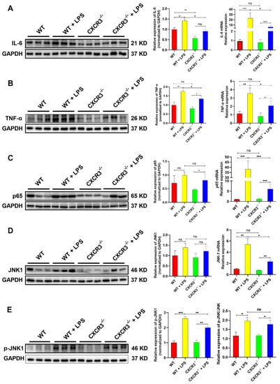 CXCR3 knockout inhibits the activation of the NF-κB signaling pathway in the mouse intestine. C57BL/6J WT mice and CXCR3−/− mice were intraperitoneally injected with LPS 10 mg/kg. After 24 h, the mice were sacrificed. The mRNA and protein of jejunum tissue were extracted. qPCR and Western Blot assays were used to investigate the mRNA and protein expression of the NF-κB signaling pathway. (A) IL-6 mRNA and protein expression. (B) TNF-α mRNA and protein expression. (C) p65 mRNA and protein expression. (D) JNK1 mRNA and protein expression. (E) JNK1 phosphorylation. The protein optical density values were analyzed by Image J software. Values represent the mean ± SEM. of three independent experiments. Significant differences are represented by * p < 0.05, ** p < 0.01, *** p < 0.001, and ns (not significant).