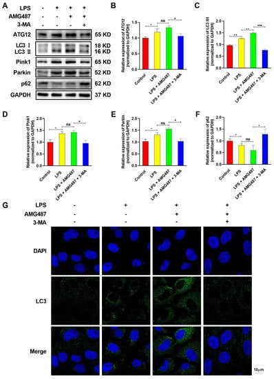 CXCR3 inhibition promotes autophagy in IPEC-J2 cells. The cells were divided into four groups, namely, the Control group, LPS (10 μg/mL) group, LPS + AMG487 (1 μM) group, and LPS + AMG487 + 3-MA (5 mM) group. The cells were treated for 12 h, and the protein was extracted for Western Blot. Indirect immunofluorescence assays were explored. (A) The expression of autophagy-related proteins in IPEC-J2 cells. (A,B) Parkin expression, (A,C) PINK1 expression, (A,D) p62 expression, (A,E) LC3 expression, and (A,F) ATG12 expression. (G) Indirect immunofluorescence laser confocal imaging of the distribution of LC3. The protein optical density values of autophagy-related genes were analyzed by Image J software. Values represent the mean ± SEM. of three independent experiments. Significant differences are represented by * p < 0.05, ** p < 0.01, *** p < 0.001, and ns (not significant).