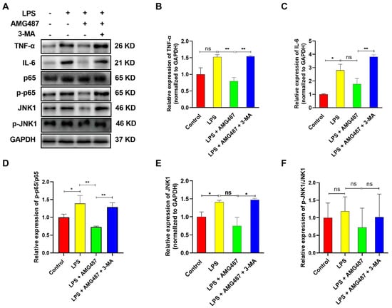 CXCR3 inhibition blocks NF-κB signaling pathway activation by promoting autophagy in the IPEC-J2 cells. The cells were divided into four groups, namely, the Control group, LPS (10 μg/mL) group, LPS + AMG487 (1 μM) group, and LPS + AMG487 + 3-MA (5 mM) group. The cells were treated for 12 h, and the protein was extracted for Western Blot. (A) The expression of NF-κB pathway-related proteins in IPEC-J2 cells. (A,B) TNF-α expression. (A,C) IL-6 expression. (A,D) p-p65/p65 expression. (A,E) JNK1 expression. (A,F) p-JNK1/JNK1 expression. Image J software analyzed the optical density values of NF-κB signaling pathway-related proteins. Values represent the mean ± SEM. of three independent experiments. Significant differences are represented by * p < 0.05, ** p < 0.01, and ns (not significant).