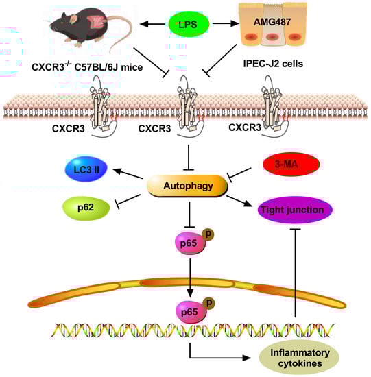 In conclusion, this paper presents evidence that CXCR3 inhibition attenuates LPS-induced inflammation and intestinal barrier damage in CXCR3−/− mice and IPEC-J2 cells by inducing autophagy. The results will provide instructions and a theoretical basis for future investigations by targeting CXCR3 in the treatment of intestinal injury (Figure 8).