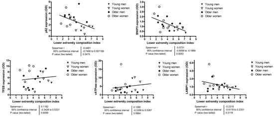 Correlation analyses between autophagy, mitophagy, and lysosomal markers and the lower extremity tissue composition index. Correlations were explored via Spearman’s statistics. The content of protein markers is expressed as optical density (OD) and is reported in arbitrary units. The lower extremity tissue composition index was calculated as the ratio between lower extremity muscle volume and intermuscular adipose tissue volume. Abbreviations: BNIP3, BCL2/adenovirus E1B 19 kDa protein-interacting protein 3; LAMP1, lysosomal-associated membrane protein 1; TFEB, transcription factor EB; vATPase, vacuolar-type ATPase.