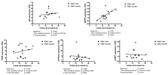 Correlation analyses between autophagy, mitophagy, and lysosomal markers and the 5-time sit-to-stand test completion time. Correlations were explored via Spearman’s statistics. The content of protein markers is expressed as optical density (OD) and is reported in arbitrary units. Abbreviations: BNIP3, BCL2/adenovirus E1B 19 kDa protein-interacting protein 3; LAMP1, lysosomal-associated membrane protein 1; TFEB, transcription factor EB; vATPase, vacuolar-type ATPase.