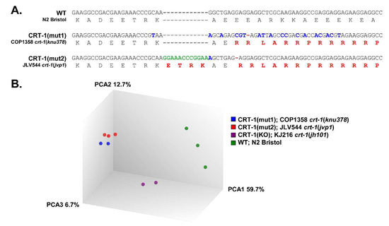 Nematodes were maintained at 20 °C on NGM agar plates seeded with the E. coli strain OP50, according to standard protocols. The following strains were used: Bristol N2 (wild type; WT), COP1358 (type 1-like crt-1 homozygous mutant; crt-1(knu378), hereinafter referred to as CRT-1(mut1)), JLV544 (type 2-like crt-1 homozygous mutant; crt-1(jvp1), referred to as CRT-1(mut2)), and KJ216 (crt-1 null mutant; crt-1(jh101) [7], hereinafter referred to as CRT-1(KO)). Bristol N2 and KJ216 were acquired from the Caenorhabditis Genetics Center (CGC, University of Minnesota, Minneapolis, MN) while type 1 and type 2-like crt-1 mutants were obtained using CRISPR/Cas9 technology (Figure 1A). We used computational methods to verify that the proteins generated in the worm maintained the properties previously observed for the human mutant proteins (Table S1) [12].