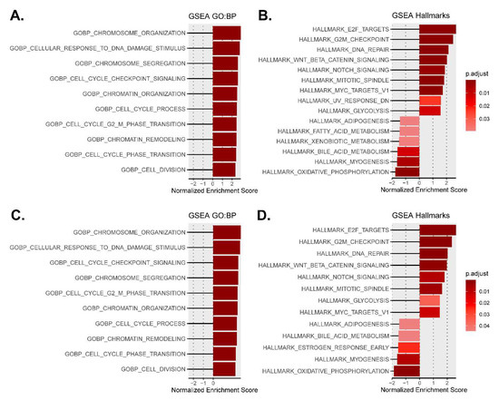 As regards the expression of genes involved in the cell cycle, a total of 46 DEGs were found, of which only 2 were downregulated. The products of these genes perform various functions, including microtubule cytoskeleton organization, cell cycle control, and DNA synthesis (Figure 5A).