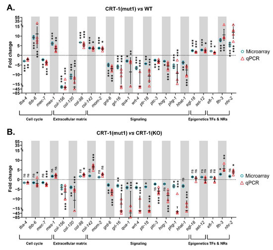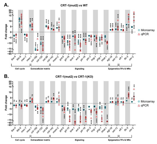 Relative expression levels of genes validated by qPCR classified according to the biological process in which they participate. (A) Data from CRT-1(mut2) vs. WT. (B) Data from CRT-1(mut2) vs. CRT-1(KO). Blue circles correspond to microarray results and red triangles represent the qPCR values of two biological replicates. Individual values, means, and SDs are represented. Differences were considered as significant (*) when p < 0.05, very significant (**) when p < 0.01, and highly significant (***) when p < 0.001.