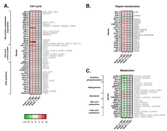 Heatmaps of microarray data showing DEGs related to cell cycle, repair mechanisms, and cellular metabolism in CRT-1(mut1) and CRT-1(mut2) worms vs. WT or CRT-1(KO) nematodes. (A) Cell cycle (microtubule cytoskeleton organization, cell cycle control system, and DNA synthesis). (B) Repair mechanisms. (C) Cellular metabolism (oxidative phosphorylation, adipogenesis, glycolysis, bile acid, and fatty acid metabolism). Mean fold-change values are represented, ranging from shades of green (negative fold-change) to shades of red (positive fold-change). Non-statistically significant differences are shown in gray. Names in gray on the right are the human orthologous genes according to Ortholist2 [11].