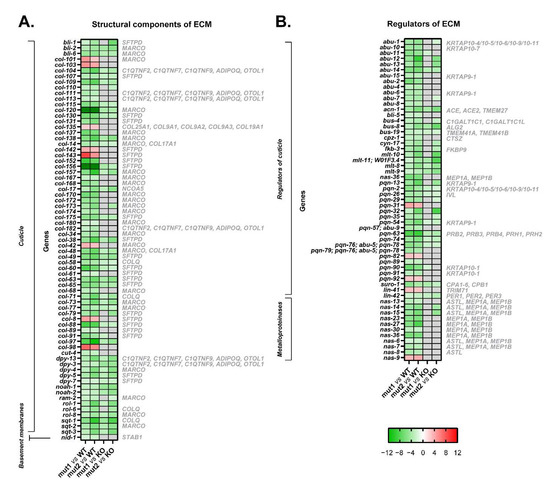 Heatmaps of microarray data showing DEGs related to the extracellular matrix in CRT-1(mut1) and CRT-1(mut2) worms vs. WT or CRT-1(KO) nematodes. (A) Structural components of the extracellular matrix (cuticle and basement membranes). (B) Regulators of the extracellular matrix (regulators of cuticle and metalloproteinases). Mean fold-change values are represented, ranging from shades of green (negative fold-change) to shades of red (positive fold-change). Non-statistically significant differences are shown in gray. Names in gray on the right are the human orthologous genes according to Ortholist2 [11].