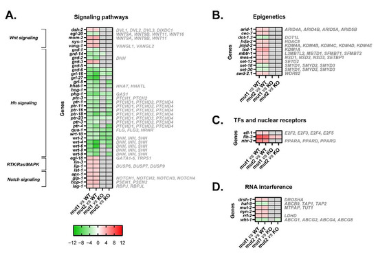 Heatmaps of microarray data showing DEGs related to a set of biological processes in CRT-1(mut1) and CRT-1(mut2) worms vs. WT or CRT-1(KO) nematodes. (A) Signaling pathways (Wnt, Hedgehog, RTK/Ras/MAPK, and Notch signaling). (B) Epigenetics. (C) Transcription factors (TFs) and nuclear receptors. (D) RNA interference. Mean fold-change values are represented, ranging from shades of green (negative fold-change) to shades of red (positive fold-change). Non-statistically significant differences are shown in gray. Names in gray on the right are the human orthologous genes according to Ortholist2 [11].