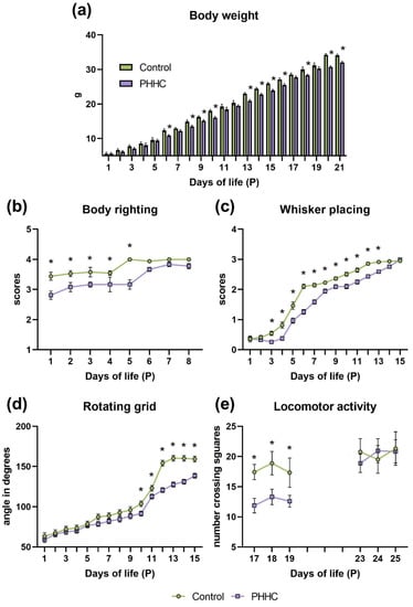 There was a significant day, group, and interaction effects for the rotating grid test (Table 2). Significant differences (p ≤ 0.05) in the maximal angle before falling of control and PHHC pups were seen from P8 to P15 (Figure 1d). On average, control pups were able to remain on a rotating grid up to 90 degrees on P7, and PHHC pups—on P10. The maximal angle before falling in the PHHC group reached was 139 to P15, while in the control group the maximal angle reached was 160 to P13.