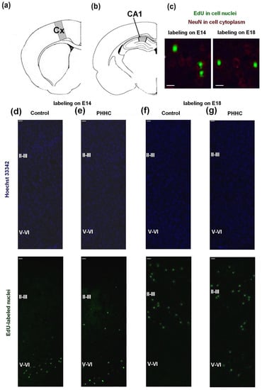 Localization and positioning of the cortical neurons generated on E14 or E18. (a) Position of the analyzed areas of the parietal cortex (Bregma +0.20 mm [35]). (b) Position of the studied area in CA1 area of dorsal hippocampus (Bregma −4.50 mm [35]). (c) Sample of the double labeling of parietal cortex in a P5 control rat. EdU labeling were performed on E14 (left) or E18 (right). Fox3-positive neurons stained by PE-conjugated secondary antibodies (red); EdU-positive cell nuclei were labeled by AlexaFluor488 (green). Scale bar 20 µm. (d) Coronal section of the parietal cortex in control pups on P5. EdU labeling (green nuclei on the lower photographs) on E14. Upper photographs show blue cellular nuclei stained by Hoechst 33342. The majority of the cells labeled on E14 are localized in the V-VI cortical layers. Scale bar 70 µm. (e) Coronal section of the parietal cortex of a P5 PHHC pup. EdU-labeling was performed on E14. Scale bar 70 µm. (f) Coronal section of the parietal cortex of a control rat on P5 with EdU-labeling performed on E18. The majority of the cells labeled on E18 are scattered within the superficial cortical layers. Scale bar 70 µm. (g) A coronal section of the parietal cortex of a P5 PHHC pup. EdU-labeling was performed on E18. Scale bar 70 µm.
