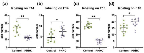 PHHC. In the parietal cortex of 5 day-old pups subjected to PHHC, we observed a decrease in the total number of EdU-positive neurons labeled on both E14 (p ≤ 0.01, Mann–Whitney U-test; see Figure 3a) and E18 (p ≤ 0.01, Mann–Whitney U-test; see Figure 3c) compared to controls. It can be suggested that PHHC causes a visible decrease in neuroblast division rate. In both PHHC animals and controls, the majority of cells labeled on E14 were destined to migrate in the V-VI cortical layers. In PHHC pups, the number of labeled neurons localized within the superficial layers of the parietal cortex was increased (p = 0.03, Mann–Whitney U-test) compared to controls (Figure 2e and Figure 3b). This can suggest that PHHC caused a failure of some neuroblasts to migrate into their proper position in the lower cortical layers. The majority of EdU-positive cells labeled on E18 were scattered within the superficial (II-III) cortical layers (Figure 2g) in both control and PHHC groups. However, in PHHC pups, the number of EdU-positive cells observed in the V-VI layers of the parietal cortex was increased (p = 0.01, Mann–Whitney U-test) compared to the control group (Figure 2g and Figure 3d). It can be suggested that these neuroblasts failed to migrate into their proper position in the II-III cortical layers.