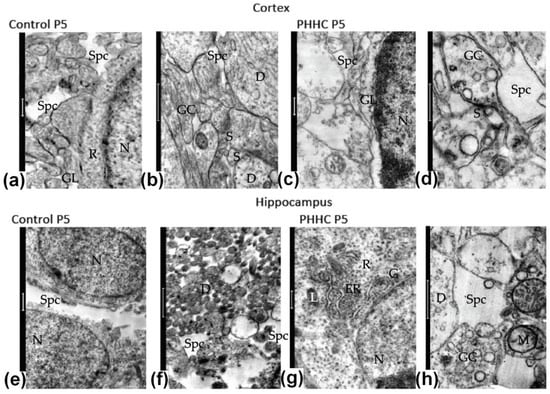 Microphotographs of the parietal cortex (a–d) and CA1 of dorsal hippocampus (e–h) tissue in P5 pups of control (a,b,e,f) and PHHC (c,d,g,h) groups. Electron microscopy. Spc—extracellular spaces; N—neuron; S—synapse; R—ribosomes; GC—growth cone; ER—endoplasmic reticulum; M—mitochondria; L—lysosomes; D—dendrite processes; GL—glial processes; G—Golgi complex. Scale: (b,d,h)—500 nm, (a,c,e,f,g)—1 µm.