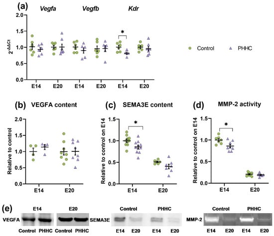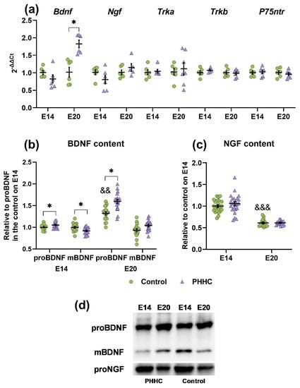 Analysis of BDNF levels in fetal brains revealed two bands with different molecular weights corresponding to the mature (~14 kDa, mBDNF) and pro-form (~29 kDa, proBDNF) neurotrophic factor (Figure 7b,d). During prenatal development, an increase in the proBDNF content by 30% from E14 to E20 was detected in the brain of rat fetuses from the control group (Figure 7b). In the PHHC group, a significant increment (Student’s t-test, p ≤ 0.05) in the level of proBDNF on E14 was revealed by 1.1 times compared with the control, as well as a decrease in mBDNF by 10%. At the same time, only a 1.2-fold increase in pro-form relative to control was noted in the fetal brain on E20.