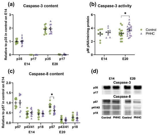 Apoptosis plays an important role during the normal development of the mammalian nervous system and is observed in populations of developing nerve progenitor cells, differentiated post mitotic neurons, and glial cells. Depending on the time, two waves of cell death can be distinguished during pre- and postnatal development. An early wave of apoptosis was observed in proliferative zones, where morphogenetic signals such as BMP, Wnt, FGF, and Sonic hedgehog proteins play an important role [8,31]. The key mediator of apoptosis is Caspase-3, which is universally expressed in the developing nervous system. It has been shown that PHHC induces DNA fragmentation, increases the level of p53 mRNA, and also leads to a decrease in the content of the antiapoptotic protein Bcl-2 in the brain tissue of newborn rats [32].