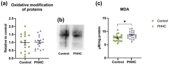 We assessed the locomotor activity of rat pups for three consecutive days immediately after opening their eyes, i.e., after P17, as well as one week after this event. There was a significant group difference for this test (F 1;11 = 4.026, p ≤ 0.001). As seen in Figure 1e, immediately after opening the eyes, locomotor activity was significantly higher in control pups (p ≤ 0.05) and remained at the same level after a week (p ≤ 0.05). In PHHC pups, the locomotor activity was initially lower than that of the control, but after a week, it reached the level of the control pups (p ≤ 0.05).