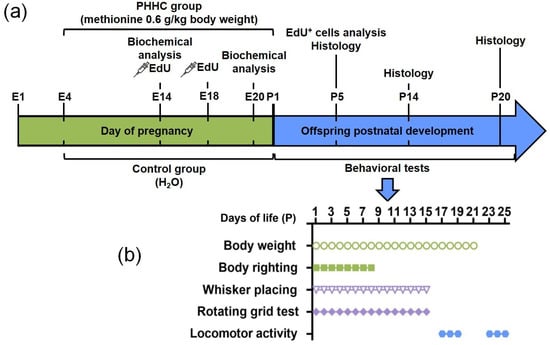 The first day of pregnancy was considered the day after the detection of sperm in the vaginal smear of the female rat. Then, the animals were daily administrated with a 0.15% aqueous solution of L-methionine (Merck, Darmstadt, Germany, 0.10–0.15 g per animal) per os from the fourth day of pregnancy (E4) until delivery [33]. This modeling method allowed achieving serum Hcy concentrations in rats similar to those described for the serum of patients with mild HHC. The chronic administration of methionine at this dose to pregnant rats caused an increase in the level of Hcy not only in the mother’s blood but also in the blood and brain of the fetus, as described in detail previously [33]. In the same period, control animals additionally received 1 mL of water using a probe. On E14 and E20, these groups of rats were decapitated, and fetuses were removed from their mothers in both groups. Embryonic brains were used for analysis. Another group of pregnant rats gave birth naturally. The day of birth was determined as P1. Pups were decapitated at postnatal days 5 (P5), 14 (P14), and 20 (P20). The treatment paradigm followed for the study is illustrated in Scheme 1a.