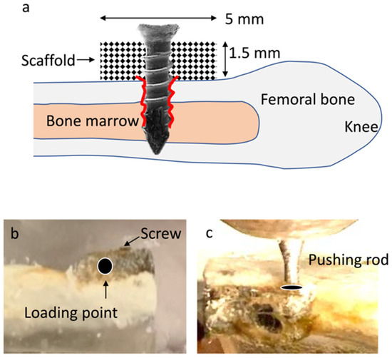 (a) Schema of the animal experiments simulating a vertical bone augmentation. A plate-form scaffold was fit and placed. The scaffold (arrow) was placed on a flat surface of innate cortical bone and fixed with a titanium screw. Note blood and cells could only gain access to the scaffold through the screw in one direction; (b) a photograph of the retrieved femur with an integrated titanium microfiber scaffold; (c) after the screw was removed, the mechanical strength between the cortical bone and scaffold was measured by vertically pushing down the scaffold (at the indicated loading point 1 mm away from the screw).