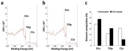 XPS revealed significant differences in the carbon peak between untreated and UV-treated microfibers (Figure 3). There was a high intensity of carbon (C1s) on untreated Ti microfiber, higher than oxygen (O1s) and titanium (Ti2p) (Figure 3a); ~30, 40, and 20% carbon, oxygen, and titanium on untreated Ti microfibers. UV treatment decreased the amount of carbon and increased the amount of oxygen and titanium to ~10, 50, and 30%, respectively (Figure 3b,c).