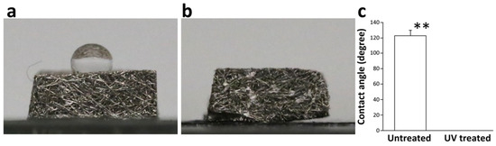 Wettability of the scaffold; (a) a water droplet forms on the untreated scaffold due to its hydrophobicity; (b) no water droplet is seen on the UV-treated scaffold due to its superhydrophilicity; (c) contact angle between the water droplet and the untreated scaffold was approximately 120°, whereas it was 0° on the UV-treated scaffold because the UV-treated scaffold completely absorbed the water droplet. ** p < 0.01.