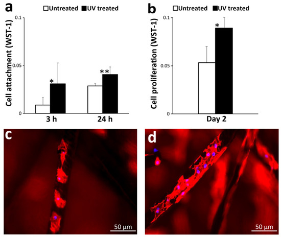 Cell attachment and propagation of rat-bone-marrow-derived osteoblasts on untreated and/UV-treated Ti microfiber scaffolds; (a) the number of cells attached to each scaffold with or without UV treatment at 3 and 24 h was evaluated by the WST-1 assay; (b) the number of osteoblasts propagated on scaffolds on day. (c,d) visualization of cells on day 2 using fluorescent microscopy, showing more cells attached to UV-treated titanium microfibers (d) than to untreated ones (c); * p < 0.05, ** p < 0.01.