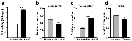 ALP activity was significantly higher in osteoblasts grown on UV-treated microfibers than untreated microfibers (Figure 7a). Osteocalcin gene expression was significantly greater in osteoblasts on UV-treated Ti than untreated Ti (Figure 7c), although there were no significant differences in osteopontin and Runx2 expression (Figure 7b,d).