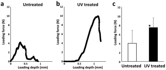 Biomechanical strength of the connection between scaffold and bone in a vertical bone augmentation model. Representative load-displacement curves are shown (a,b). The average loading force to break the titanium microfiber scaffold from the surface of cortical bone was approximately 4 N for untreated scaffold and 8 N for UV-treated scaffold (c); * p < 0.05.