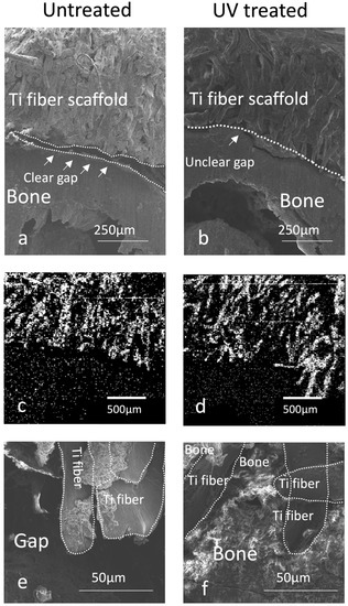 EDX mapping for elemental Ti showed that titanium microfibers were more masked in the UV-treated group than the untreated group (Figure 9c,d). Magnified SEM images confirmed the presence of large gaps between the untreated scaffold and innate bone (Figure 9e), whereas new bone infiltrated the microfiber network in the UV-treated group (Figure 9f).