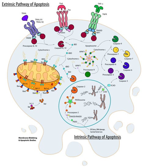 Internal stimuli such as DNA damage trigger intrinsic apoptosis by activating the pro-apoptotic BH3-only subgroup of pro-apoptotic Bcl-2 family proteins (Bim, Bid, Bad, and Puma), which in turn disrupt interactions between the pro-apoptotic Bcl-2 family proteins (Bax and/or Bak) and anti-apoptotic Bcl-2 family proteins (Bcl-2 and BCL-xL, BCL-W, MCL1, and A1/BFL-1), thus freeing Bax and Bak to mobilize to the mitochondrial outer membrane where their oligomerization is presumed to disrupt the mitochondrial outer membrane, finally resulting in the release of cytochrome c [38]. Cytosolic cytochrome c then combines with APAF1 and pro-Caspase-9 to form the “Apoptosome,” which activates the initiator pro-Caspase-9 into mature caspase-9 via autoproteolysis, in turn activating effector Caspases 3, 6, and 7 (Caspase-3 is the primary effector caspase) that carry out cell death. Endoplasmic reticulum (ER) and genotoxic stresses can also lead to the activation of the initiator Caspase-2 through the PIDDosome multicomplex (containing PIDD, CRADD/RAID, and pro-Caspase-2) which in turn activates Bid into tBid (truncated Bid) by cleavage, initiates Bax-mediated mitochondrial outer membrane disruption, and eventually leads to Caspase-9 dependent intrinsic apoptosis [39,40,41].