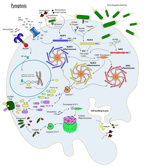 Pyroptosis is a form of inflammatory PCD which involves either Caspase-1-dependent canonical inflammasomes or non-canonical inflammasomes driven by Caspase-11 (in mice) or Caspase-4 and Caspase-5 (in humans) [50,51] and summarized in Figure 2. Canonical inflammasomes are multiprotein oligomeric structures formed by ASC adaptor proteins bridging the interaction between NLRP1b, NLRP3, NLRC4, AIM2, or Pyrin (canonical inflammasome subtypes) with pro-Caspase-1 in response to external or internal stimuli (e.g., extracellular adenosine triphosphate (ATP), microbial products, or DAMPs), ultimately culminating in the activation of Caspase-1 though autocleavage and processing [52,53]. In contrast to Caspase-1, which requires the assembly of the aforementioned multiprotein inflammasome complexes for its activation, Caspases 11, 4, and 5 do not require multiprotein complexes for self-processing and activation. Rather, it appears that their activation results from the direct interaction between their CARD domains with intracellular LPS through its lipid A moiety [54,55,56]. Activated Caspases 1, 11, 4, and 5 then drive the cleavage of the pro-pyroptotic factor Gasdermin D (GSDMD), which then oligomerizes to form pores in the plasma membrane causing cell death [55,56,57]. It is worth noting that in contrast to pro-Caspase-1 which is expressed in resting cells, pro-Caspase-11 is not expressed in resting cells and its expression requires priming by LPS which triggers a signaling pathway involving Toll-like receptor 4 (TLR4)/MyD88/NF-κB [58].