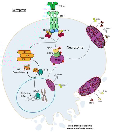 - Dhuriya, Y.K.; Sharma, D. Necroptosis: A regulated inflammatory mode of cell death. J. Neuroinflammation 2018, 15, 199. [Google Scholar] [CrossRef]
