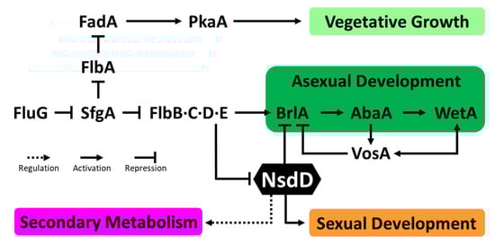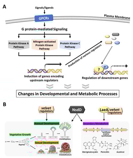 A large array of upstream regulators affecting conidiation, sexual development, and secondary metabolism in Aspergillus species have been identified and functionally studied [,,,,,,]. In this review, we summarize a few different types of upstream regulators, known for their roles in main upstream regulation of Aspergillus biology (Figure 1): G proteins and G protein-coupled receptors (signal transduction), the velvet family proteins (development and metabolism), LaeA (secondary metabolism), and NsdD (development and secondary metabolism).