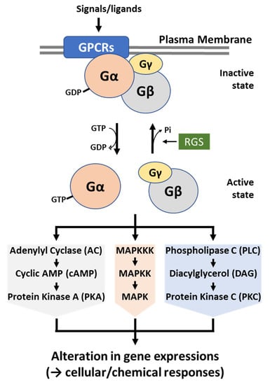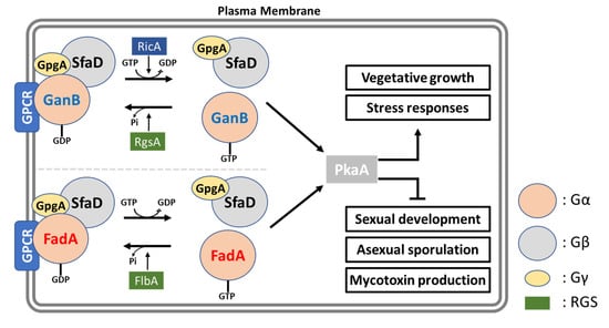 Heterotrimeric guanine nucleotide-binding proteins (G proteins), consisting of alpha, beta, and gamma subunits, have been characterized in diverse eukaryotic organisms demonstrating their pivotal roles in major signal transduction pathways during the responses of cells to extracellular stimuli. The G proteins, present in all eukaryotic cells, control metabolic and developmental pathways (reviewed in []). In filamentous fungi, the first G proteins, particularly α subunits, were discovered in N. crassa in the early 1990s. Thereafter, the G proteins FadA (α subunit), SfaD (β subunit), and GpgA (γ subunit) were identified in A. nidulans [,,]. The inactive G protein heterotrimer is composed of α, β, and γ subunits, whereas the α and γ subunits are associated with the plasma membrane. Upon binding of specific ligands, GPCRs experience a conformational change, then physically interact with heterotrimeric G proteins. This physical interaction results in an exchange of GTP for GDP on the Gα subunit, which in turn leads to the dissociation of the heterotrimer into the GTP-Gα subunit and the Gβγ heterodimer. Once dissociated, the GTP-Gα and the Gβγ become active so that GTP-Gα, Gβγ, or both moieties can relay and amplify signals by regulating activities of downstream effector proteins in divergent signal transduction pathways. Then, RGS proteins interact with an activated GTP-Gα subunit and increase its intrinsic GTPase activity. The GTP hydrolysis enables GDP-Gα subunit to reassociate with Gβγ heterodimer and plasma membrane, becoming into the inactive form of heterotrimeric G proteins again. In fungi, G protein-mediated signaling pathway is transmitted through one or more of the following pathways: (1) cAMP-dependent protein kinase (PKA), (2) mitogen-activated protein kinase (MAPK), and (3) Ca2+- and DAG-dependent protein kinase C (PKC) (Figure 2) [,].