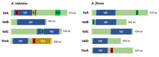 Domain architecture of the velvet regulators in A. nidulans and A. flavus. VD: velvet domain, NLS: Nuclear localization signal, NES: nuclear export signal, PEST: Proline (P)-, glutamic acid (E)-, serine (S)-, and threonine (T)-rich sequence, TAD: transcription activation domain, aa: amino acids.