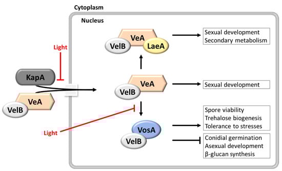 Individual velvet protein plays multifunctional roles in Aspergillus development and metabolism; however, the most significant trait of velvet proteins is that they interact with partner proteins including themselves, and form complexes in multiple combinations, which govern the various processes of fungal biology. The formation of velvet protein complexes occurs in a cell type- and/or timing-specific manners. Among all different velvet protein complexes, the three most extensively studied complexes, VosA-VelB, VelB-VeA, and VelB-VeA-LaeA, are discussed here (Figure 5). During germination, the VosA-VelB heterodimer inhibits conidial germination rates. Moreover, the VosA-VelB heterodimer controls spore viability, trehalose biogenesis, β-glucan synthesis, and tolerance of conidia to various stresses, such as heat and oxidative stress. The VelB-VeA complex is a key participant in sexual development. Although the molecular mechanism of the VelB-VeA heterodimer formation has not been clearly identified yet, the VelB-VeA complex plays an important role in sexual development as an activator. Furthermore, as VeA bridges between the VelB-VeA heterodimer and LaeA, the VelB-VeA complex interacts with LaeA and forms the VelB-VeA-LaeA heterotrimeric complex in the nucleus. This VelB-VeA-LaeA complex regulates sterigmatocystin production and sexual development in the dark. In addition, it controls the expression of secondary metabolism-related genes at transcriptional or epigenetic levels [,,].