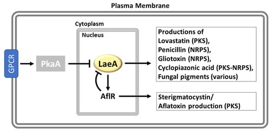 Secondary metabolism is inseparable from fungal growth and development. Secondary metabolites have received much attention due to their broad spectrum of pharmaceutical and/or toxic properties: antibiotic, antiviral, antitumor, and immunosuppressive activities, and phytotoxic and mycotoxic activities [,,]. Two decades ago, Butchko et al. [] performed mutagenesis screening on 23 mutants that exhibited loss of sterigmatocystin (ST) production but normal asexual development in A. nidulans to reveal genes that are specific for the regulation of secondary metabolism. Thereafter, Bok and Keller investigated one of these mutants and identified a novel nuclear protein, LaeA, as a global regulator of secondary metabolism in Aspergillus (Figure 6) [].