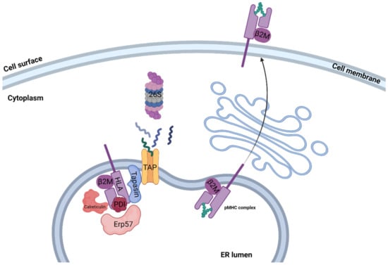 Assembly of peptide/MHC class I complex is a multistep process, starting with the temporally stabilization of the MHC class I heterodimer, containing the β2M light chain and the variable heavy chain, by ER chaperones such as calreticulin, ERp57, PDI, and tapasin, creating the peptide loading complex (PLC) []. Then, the usually 8–12 amino acid (aa) long peptide bound to TAP interacts with tapasin, delivering the peptide to the ER lumen. Release of all MHC chaperones occurs if the delivered peptide binds the MHC class I peptide binding groove with sufficient affinity, creating a stable peptide/MHC class I complex []. During assembly, a certain MHC class I molecule may switch several different peptides, resulting in a conformational change in each peptide exchange. ER release and transport to the cell surface occur when a high affinity peptide binds the MHC binding groove, creating a stable peptide/MHC class I complex []. Peptides that failed to stabilize the MHC class I molecule are transformed back to the cytosol for full degradation via the ER-associated degradation (ERAD) pathway []. An illustration of the pMHC assembly process can be seen in Figure 1.