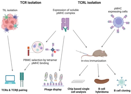 TCR and TCRL isolation methods. Illustration of TCR and TCRL identification and isolation process. TCR sequences targeting tumor-related pMHC dependent epitopes can be identified via isolation of TILs, present in the tumor environment, or via flow cytometry analysis of PBMCs, using fluorophore labeled pMHC tetrameric complexes. In both cases, computational analysis is required for TCRα and TCRβ pairing. TCRL isolation can be achieved using phage display libraries, where phages are scanned against the pMHC of interest or by in vivo immunization, using recombinant pMHC molecule or pMHC expressing cells, followed by hybridoma analysis, B cell cloning, or chip-based single cell analysis.