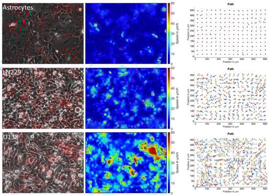 Migration of astrocytes and glioblastoma cells. Each row shows a typical phase contrast image, overlaid with the vectors of the velocity fields (left), the magnitude of the velocity and its direction (center) and typical cellular movement over the time course of 20 h (right). Red dots denote the start and blue dots the end position.