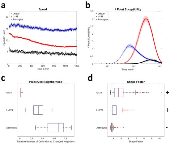 Collective migration properties of astrocytes and glioblastoma cells. (a) Graph of the mean speed per field of view over time, evaluated for 81, 33 or 18 fields of views for LN229, U138 or astrocytes, respectively. (b) 4-point susceptibility as obtained from the velocity fields over the whole measurement time. Peak positions of the 4-point susceptibility represent the average life time of collectively moving packs of cells. Sample sizes were identical as reported in (a). (c) Analysis of layer reorganization in terms of cells without making new neighbors. Sample sizes were identical as reported in (a). (d) Differences in shape factor between the cell types measured during live-cell imaging. The dotted line shows the critical value of 3.81 predicted by the vertex model. Below cells are considered to be jammed. “+” and “−” depict if shape factors are significantly larger or smaller than the critical value, with p < 0.0001 for all cell types, as tested with sign test. For shape factor calculation 2645, 772 or 269 LN229, U138 cells or astrocytes were measured from the fields of view. (b,c) Error bars and shaded areas depict the standard error of the mean. (c,d) Box plots show the median (red line), 25 and 75 percentile (box), non-outlier range (whiskers) and outliers (red dots).