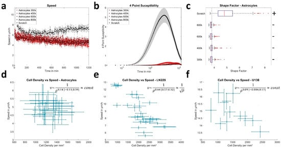 Cell density dependence of collective migration. (a) Measured mean speeds of astrocytes per field of view when seeded in different densities of 300k, 400k, 600k, 800k cells or subjected to a scratch, measured for 18 or 20 (scratch) fields of view. (b) Illustration of the 4-point susceptibility over the whole measurement time. Peak positions of the 4-point susceptibility represent the average life time of collectively moving packs of cells. Sample sizes are identical to (a). (c) Illustrates the difference in shape factor for different seeding densities of astrocytes and during the wound healing assay. The dotted line shows the critical value of 3.81 predicted by the vertex model. Below cells are considered to be jammed. “+” and “−“ depicts if shape factors are significantly larger or smaller than the critical value, with p < 0.0001 for all instances, as tested by sign test for 256, 269, 234, 183 or 386 astrocytes for seeding densities of 300k, 400k, 600k, 800k cells or the scratch. (d–f) Plot of the cell density over the speed for astrocytes, LN229 and U138 cells. Formulas show the scaling behavior of the speed v with cell density δ. Values in brackets denote 95% confidence intervals. (a,b,d–f) Error bars and shaded areas depict the standard error of the mean. (c) Box plots show the median (red line), 25 and 75 percentile (box), non-outlier range (whiskers) and outliers (red dots).