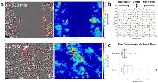 Behavior of astrocytes after wound closure. (a) Shows phase contrast images of astrocytes subjected to a scratch at different time points after the injury, overlaid with the velocity vectors (left). The right part shows the local speed and its direction. (b) Depiction of the movement paths taken by the cells of (a) after scratch closure. Red dots denote the start and blue dots the end position. (c) Illustration of the difference in shape factor for two distinct regions (see (b)) of the wound healing assay after scratch closure. The dotted line shows the critical value of 3.81 predicted by the vertex model. Below cells are considered to be jammed. “+” depicts if shape factors are significantly larger or smaller than the critical value with p = 0.049, as tested by sign test for 61 or 85 cells at the center or in the non-center region. Box plots show the median (red line), 25 and 75 percentile (box), non-outlier range (whiskers) and outliers (red dots).