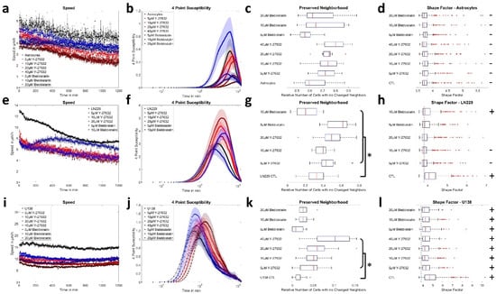 Furthermore, the speed of LN229 cells scaled with cell density as and for U138, it was independent of density (Figure 3e–f). Such scaling behavior as for LN229 cells was predicted previously, when cell speed was determined by an equilibrium of expansive and contractile forces [24,50]. Notably, if the cell density was increased further via experimental times up to 60 h, the described behavior for U138 cells did not change (Figure S5). In contrast, the characteristics for LN229 cells approached those of astrocytes, with reorganization times of 13 h and a similarly conserved neighborhood as astrocytes with up to 80% conservation in a 20 h time window (Figure S5). Due to the very high cell densities, single cells could no longer be distinguished and cell density analysis was not performed. Taken together, cell density seemed to be a possible inducer of jamming in GBM cells, but in a cell line dependent manner. Next, we investigated additional cell-density independent mechanisms involved in jamming of GBM cells. Therefore, a disturbance of the force balance was induced.