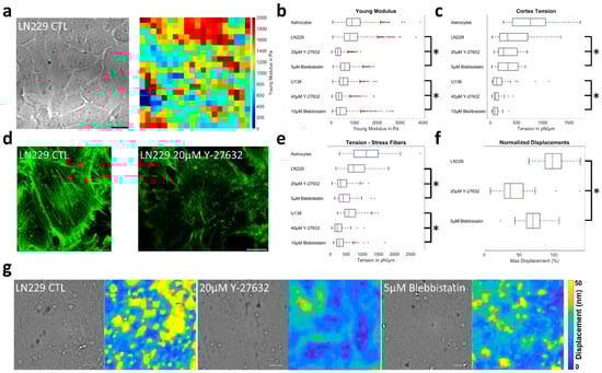 Biomechanical properties of astrocytes and glioblastoma cells. (a) Illustration of a typical 140 × 140 µm2 dense layer of LN229 cells used for measuring elastic moduli (left) and the respective map of the elastic moduli (right). Scale bar represents 20 µm. (b) Measurements of the Young moduli for astrocytes and both GBM cell lines, when treated with the ROCK inhibitor Y-27632 or myosin II inhibitor blebbistatin. p < 0.0001 for all significant results, as assessed by one way ANOVA with Tukey post hoc test. For astrocytes 1187 sample curves were obtained. For LN229 1568, 1566 or 1585 and for U138 cells, 1161, 1164 or 1148 measurement curves were evaluated for control conditions, Y-27632 or blebbistatin treatment, respectively. (c) Cortical tension of astrocytes, LN229 and U138 cells, when subjected to ROCK or myosin II inhibition. p < 0.05 for all LN229 measurements and U138 control conditions vs. 10 µM blebbistatin. p < 0.01 for U138 vs. 40 µM Y-27632. One way ANOVA with Tukey post hoc test was used. For astrocytes, 45 cells were measured. For LN229, 55, 55 or 53 and for U138, 55, 53 or 54 cells were measured for control conditions or when treated with Y-27632 or blebbistatin, respectively. (d) A typical actin staining of LN229 cells in control conditions (left) and when treated with 20 µM of Y-27632 is shown. Scale bars depict 10 µm. (e) Estimation of the tension generated by stress fibers by astrocytes and GBM cell lines. 75 cells in 15 fields of view were analyzed in each group. p < 0.0001 for all significantly different treatments, as assessed by one way ANOVA with Tukey post hoc test. (f) Normalized bead displacements obtained from the TFM measurements for LN229 cells. p < 0.0001 for all significantly different treatments. (g) Sample images and the respective displacement maps for (un-)treated LN229 cells. Scale bars depict 50 µm. (b,c,e,f) Box plots show the median (red line), 25 and 75 percentile (box), non-outlier range (whiskers) and outliers (red dots). Stars (*) depict statistically significant results.